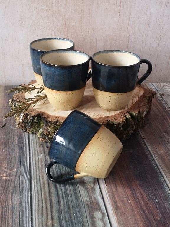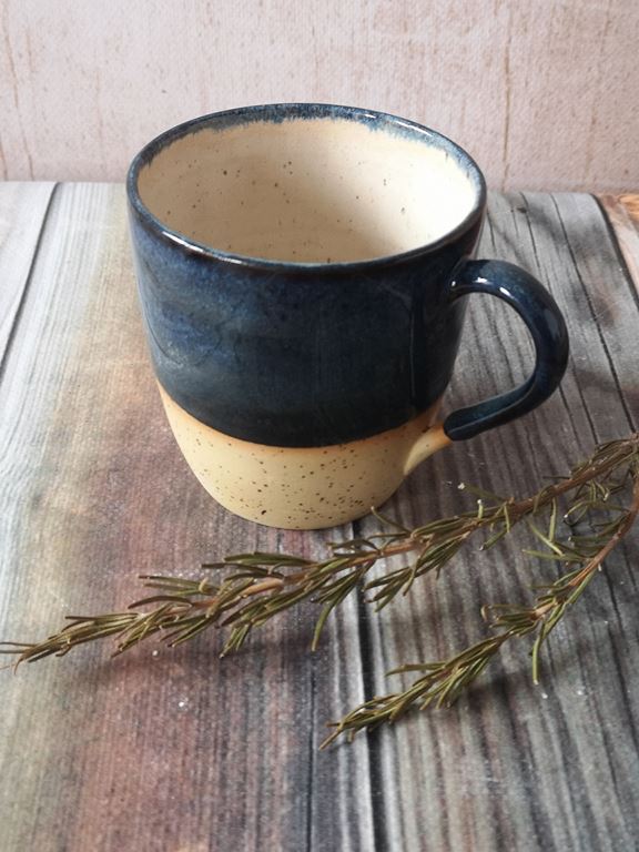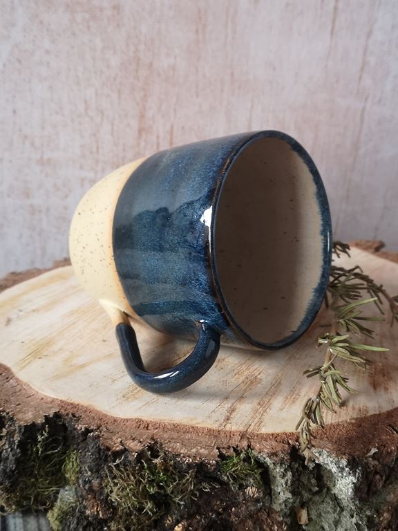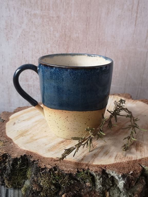 Górna część kubka została pokryta błyszczącym szkliwem w odcieniach błękitu i granatu, które pięknie kontrastuje z surową, nakrapianą gliną w dolnej części. Takie wykończenie nie tylko zachwyca wyglądem, ale również zapewnia komfort użytkowania. Wnętrze kubka jest w całości szkliwione, co ułatwia utrzymanie go w czystości i zapewnia bezpieczeństwo podczas picia gorących napojów.